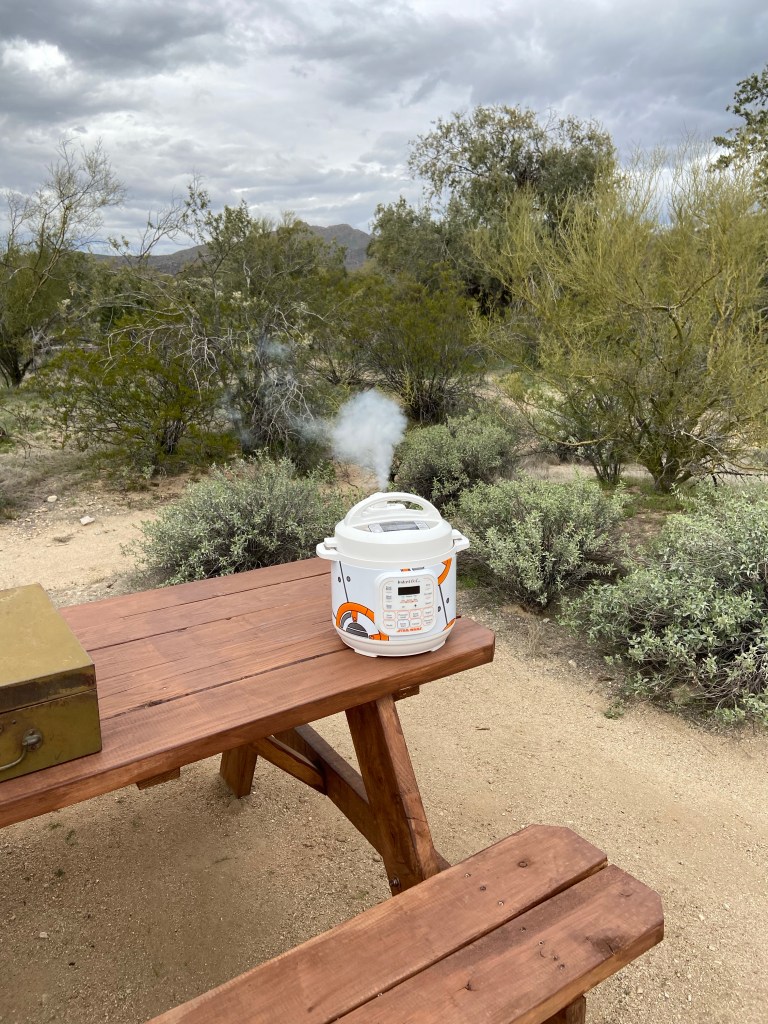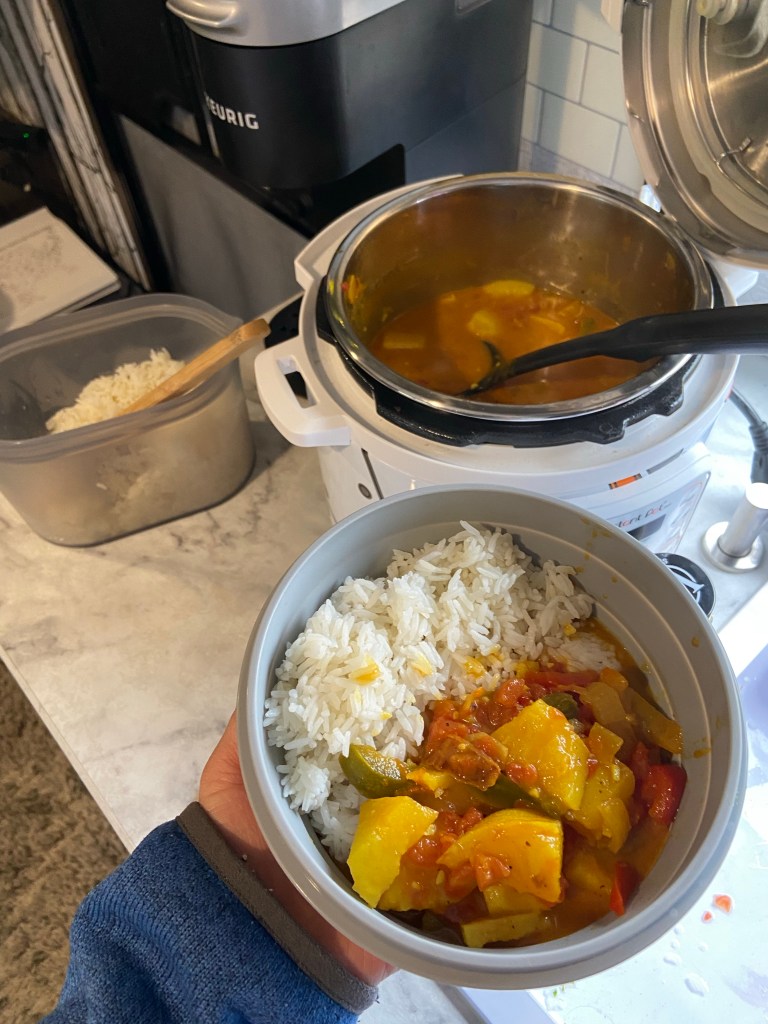 We are relaxing at the campsite/camper this evening and I made a vegan curry in the instant pot. The instant pot is seriously is one of my favorite things to cook in these days. The little mini BB8 3-quart one has been nice to utilize in the camper. Tonight it made the rice and then the curry, with quick releases outside.