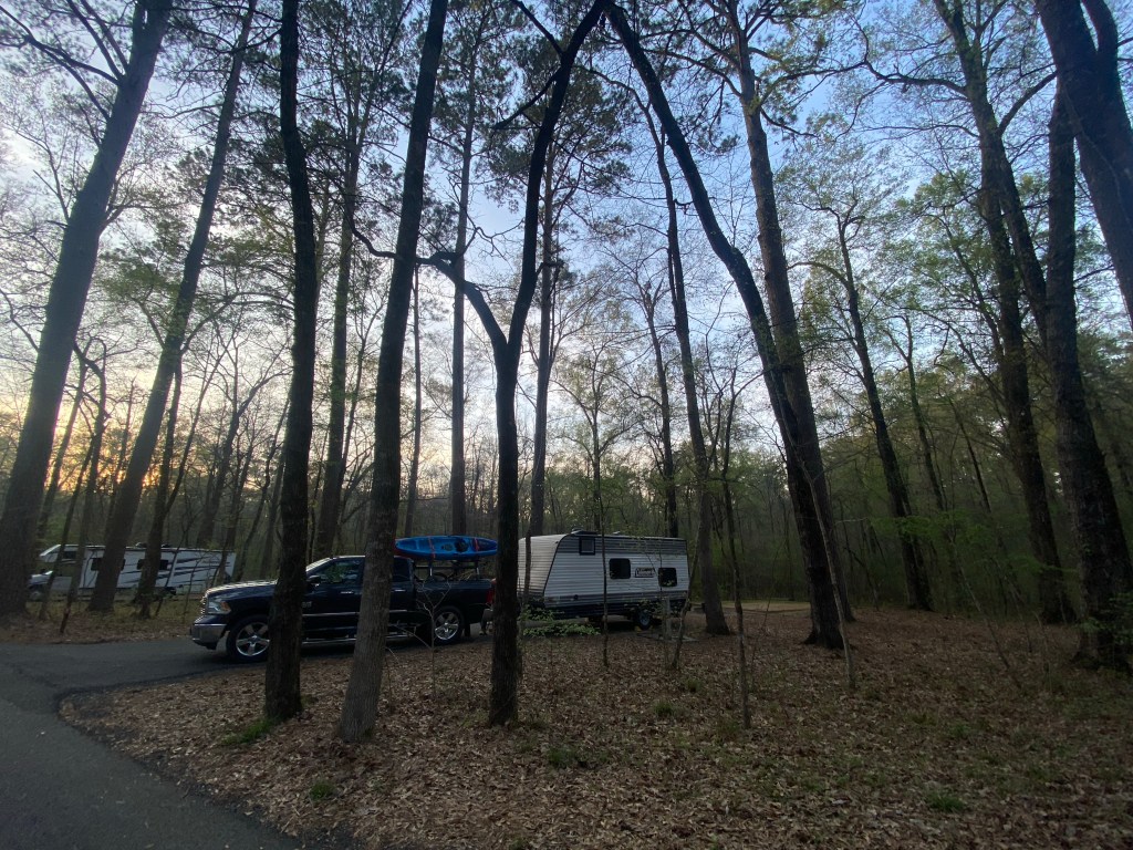 Our campsite… hot and humid, but gorgeous! (And there’s bugs!) We definitely aren’t in San Diego anymore. We had to turn on our AC for a bit upon arrival to cool the camper down.