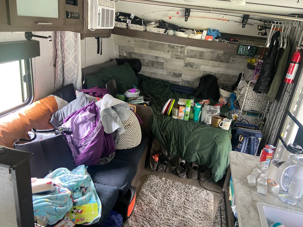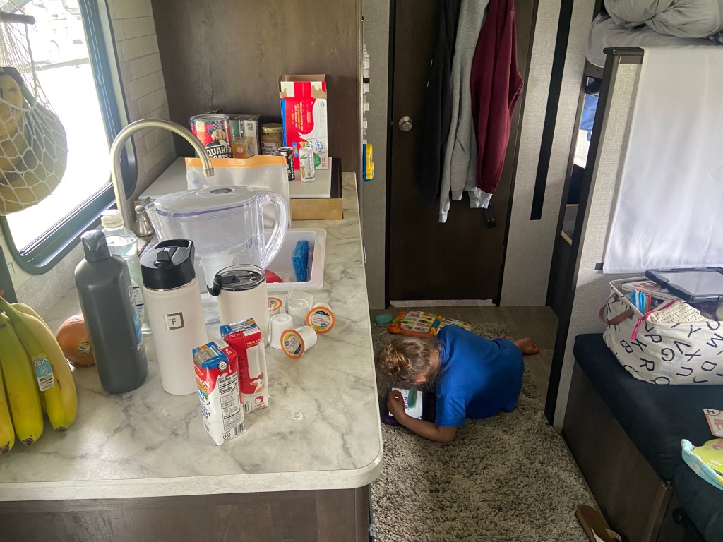 Amelia and I opted to stay back at the camper and re-organize a bit. We stopped and bought groceries this morning and I was motivated to sort through our storage to throw a couple things away, and stash stuff under Amelia’s bed that we really aren’t using. We LOVE the versatility of our tiny camper, but the storage is quite limited and things that aren’t being used can’t stay/stay out.