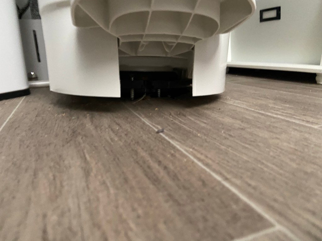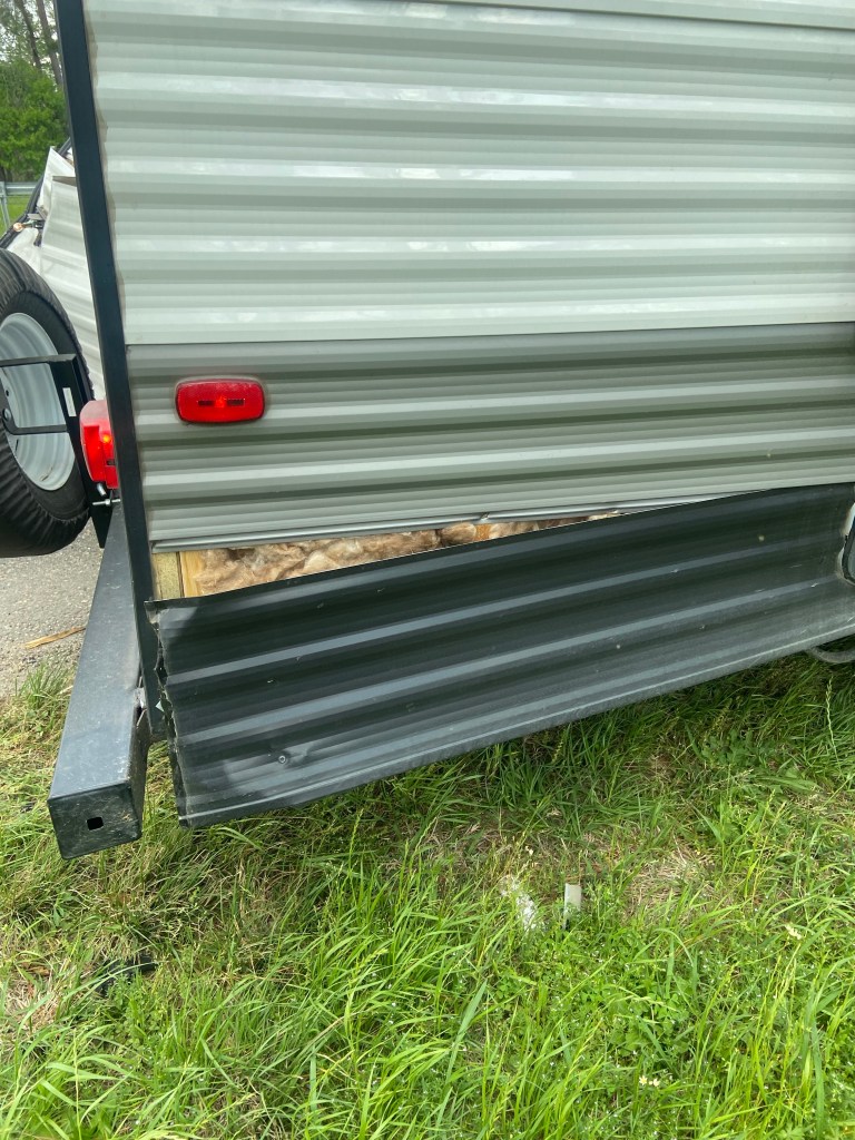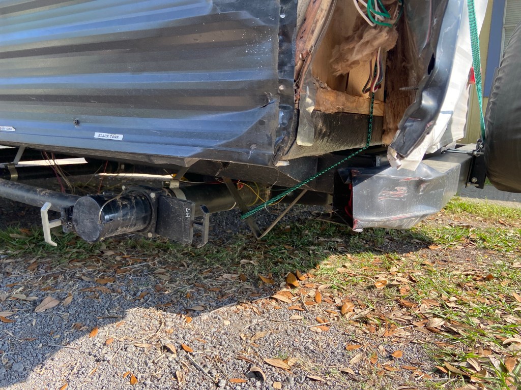 The toilet, and probably the black and grey tanks, were likely impacted. The side of the bumper that holds the “stinky slinky” is curled in now. (See the next two photos). Lucky, DJ had dumped the black and grey tanks this morning before we left, so nothing gross was leaking if they did crack.