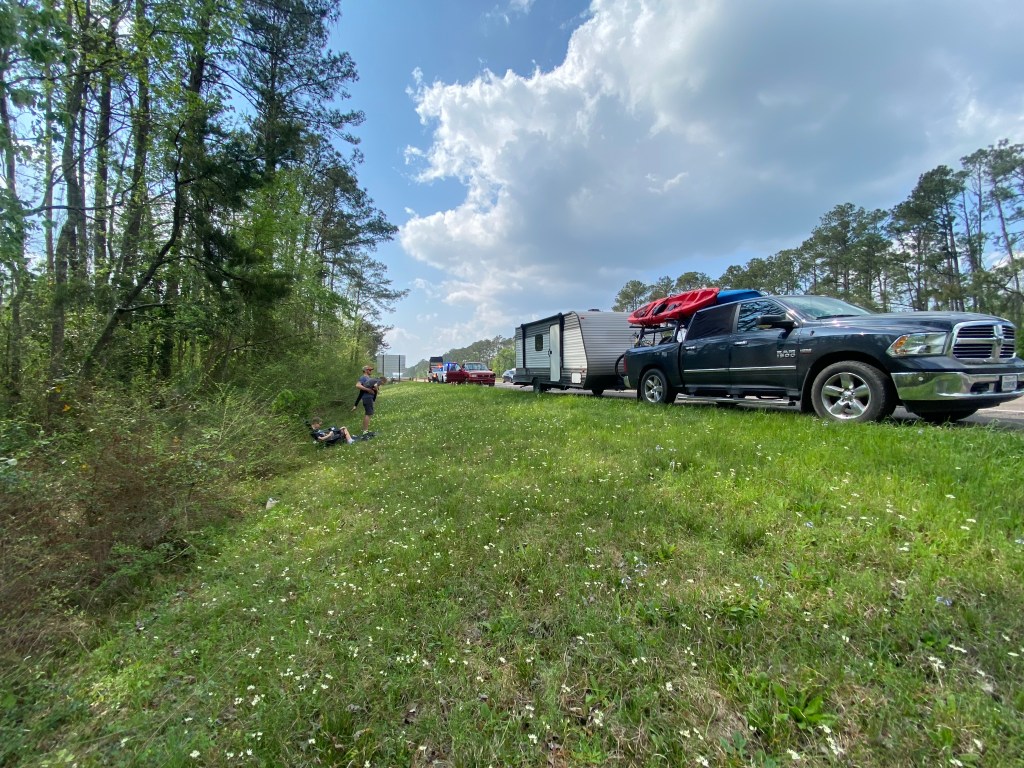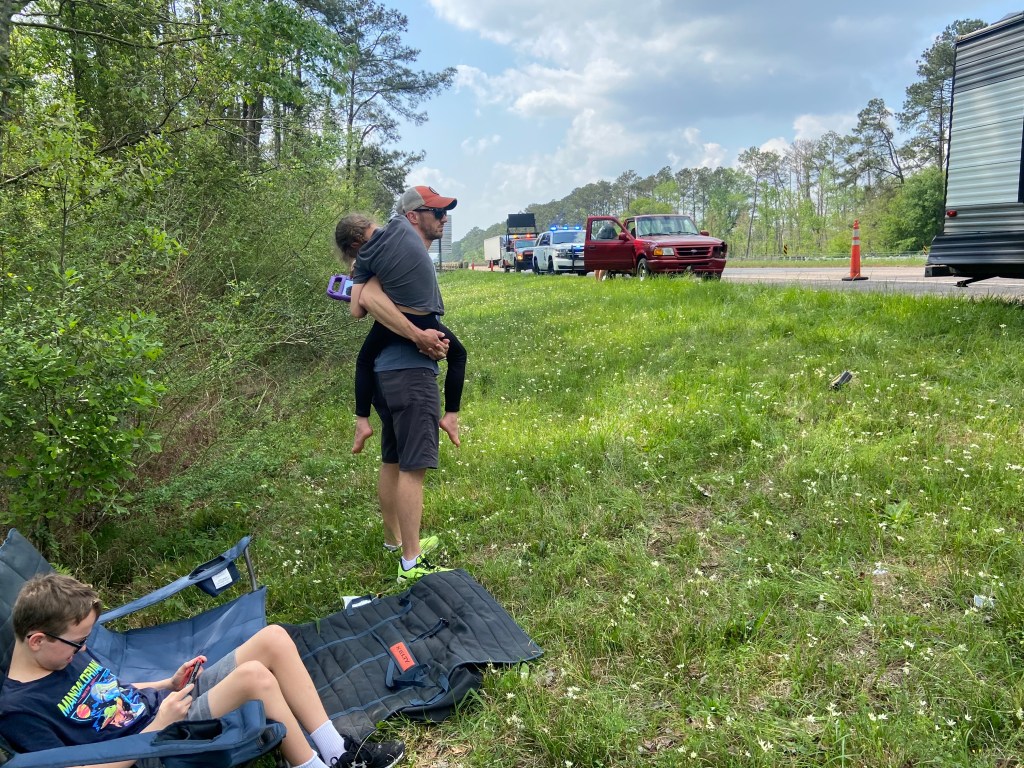 While waiting for the state trooper though, the traffic started to eventually speed up to more normal speeds going past us. DJ noticed and promptly got the kids out of the truck and as far away from the interstate as possible.