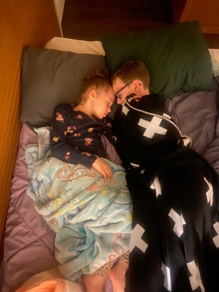 As mentioned above, Amelia was awake a lot of the night… which meant she was asleep when we got hit. As the other truck hit the camper and not our truck, the impact wasn’t much inside our truck. No airbags went off… it was more of a jolt like when we’ve hit big potholes with the camper. Amelia slept though it and it barely phased Jackson.