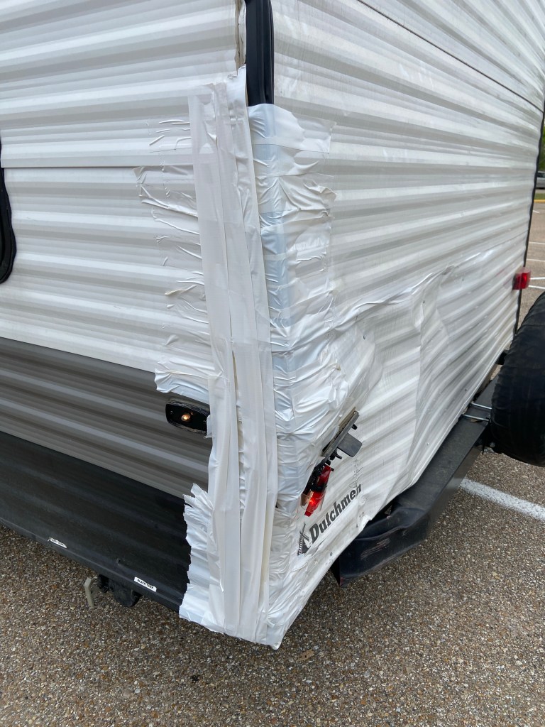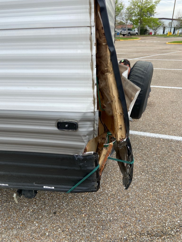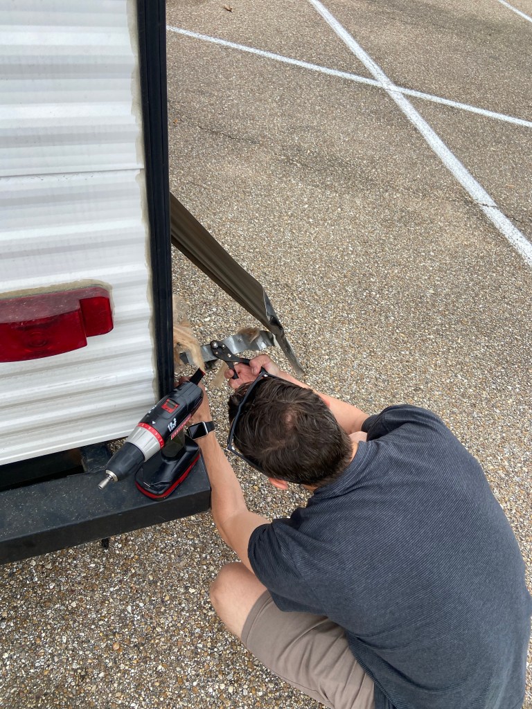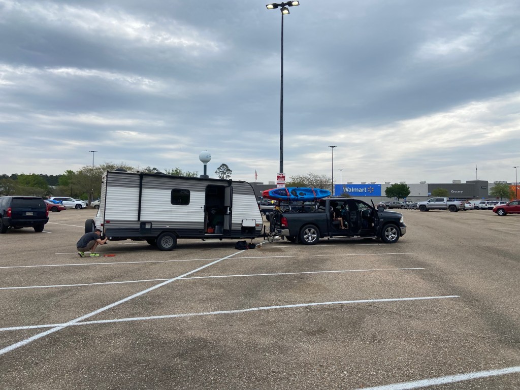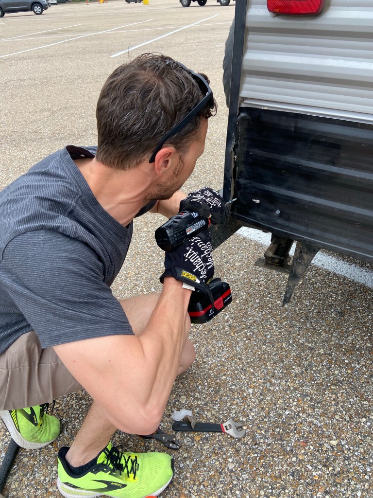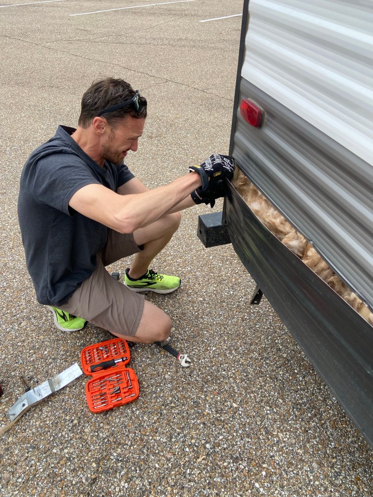 This morning we checked out of the Jellystone cabin and headed to the nearest Walmart. DJ spent a couple hours patching/ fixing the camper to make it better suited to drive.