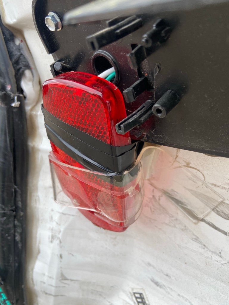 Double sided tape for the win. We grabbed a cover from one of the side lights and hobo-attached it to the brake light. Not ideal, but it’s red. Again, goal is to just patch it to get it to VA.