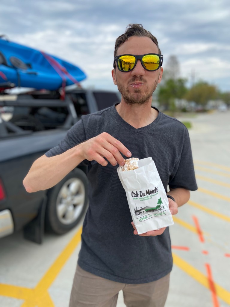 His face says it all. Those beignets were well deserved after the work he put in at Walmart patching the camper.