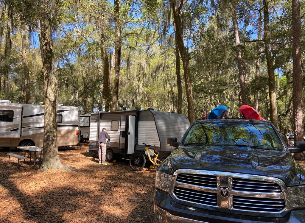 Today we got up, did breakfast at about 9 am at the hotel, right before they stopped serving breakfast and then went and moved the camper. The reservation DJ had booked was in 2 parts, so we had 2 different campsites. While we were messing around with the camper, Becca and crew grabbed Jackson and they went on a short hike/walk where they saw 2 alligators and several turtles.