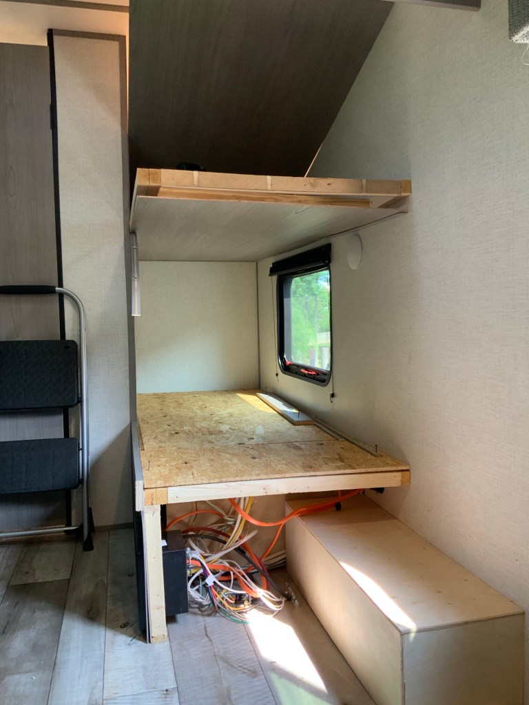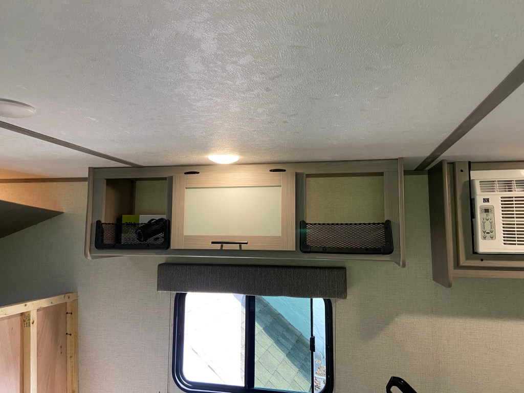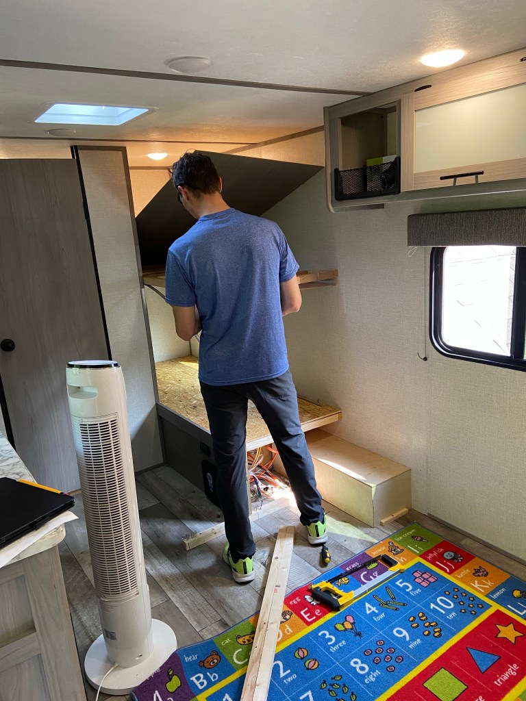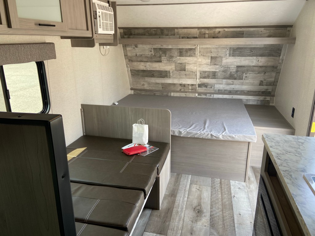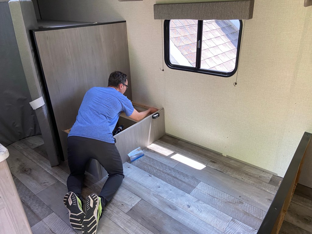 DJ removed the entire dinette/couch and the bunk wall. The photo below isn’t ours, it’s the goal (minus the fact we aren’t adding a futon). I’m in a 17B camper Facebook group that people show their modifications and ask for help/get ideas. This group is a fabulous resource and motivated this entire demolition. We want to open up our camper to have more floor space for Amelia and our newest member of the family, our puppy Messi.