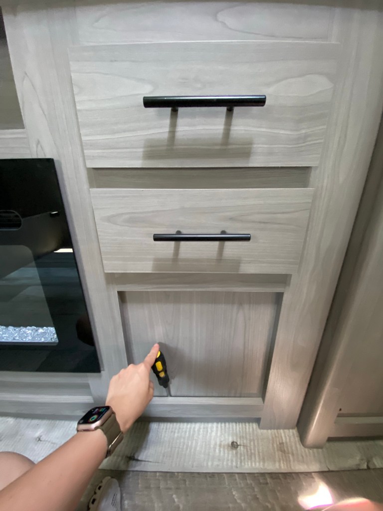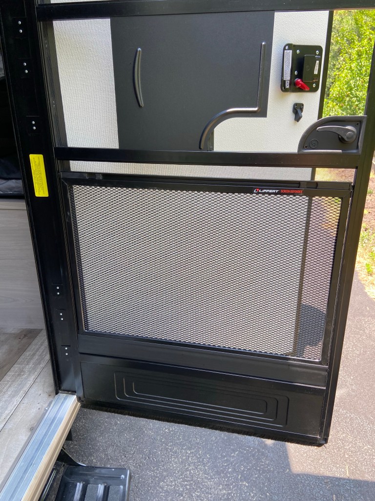 I added a screen door protector today, knocked out the panels in the upper cabinet and added the mesh netting, knocked out the panel under the 2nd drawer, vacuumed up all the saw dust and metal shavings that I could (they are terrible about this and our first one was a mess too… especially storage spaces), added the mirror to the door in the bathroom, attached our magnetic board for our spices, added the paper towel holder, helped DJ a little with his demolition and picked up some pizza for dinner!