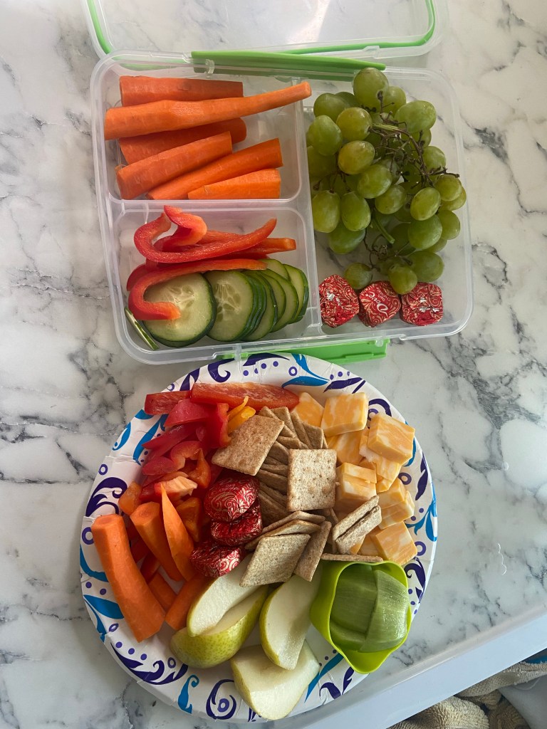 DJ and I did smoothies and “picky bits” (our new term for charcuterie since we are skipping the meat) for lunch and we grabbed Jackson a cheeseburger meal and Amelia some French fries at the McDonald’s at the gas station. Dinner tonight was leftover Einstein bagels that I bought Friday for a quick and easy dinner before we left.