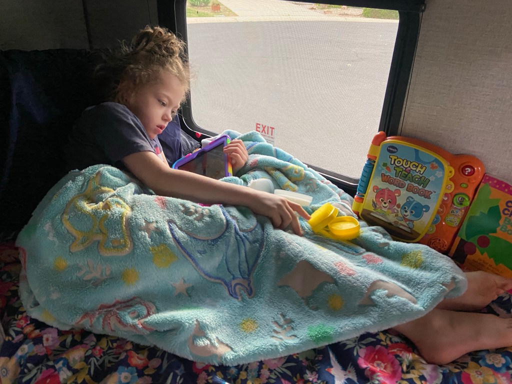 We have had a super fun, low-key day hanging at DJ’s sister’s and her husband’s house. Amelia had a rougher night last night and needed a very slow and snuggly morning today. (Definitely proof the camper is fabulous for her and we are using it exactly how we told Make-A-Wish we would… as a comforting space for her with all her supplies available).