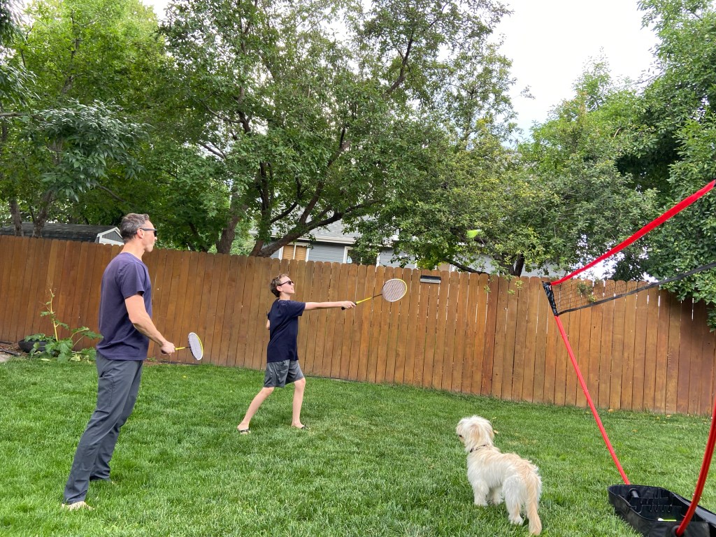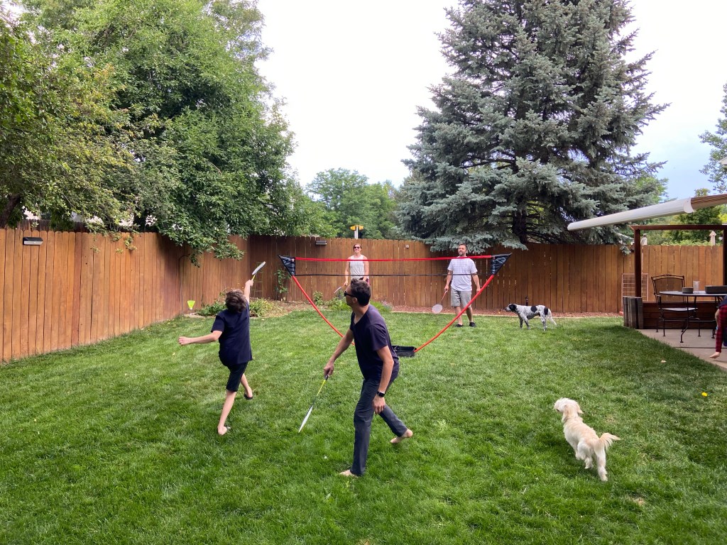 This afternoon we hung out in the backyard in between some short rain storms. A couple different yard games were played… but our group favorite today was badminton. BTW- We definitely need to get our own set to keep with our camping stuff.