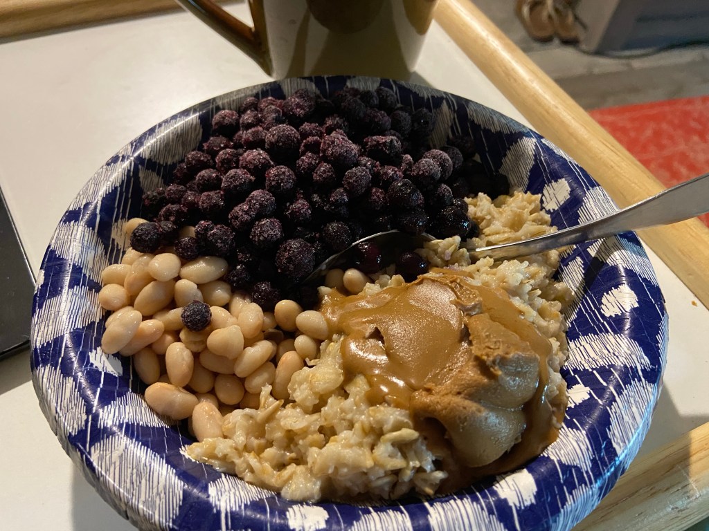 Obviously I had my favorite oatmeal, frozen blueberries, navy beans, and Trader Joe’s cookie butter. It is fabulous and I highly recommend you try it!