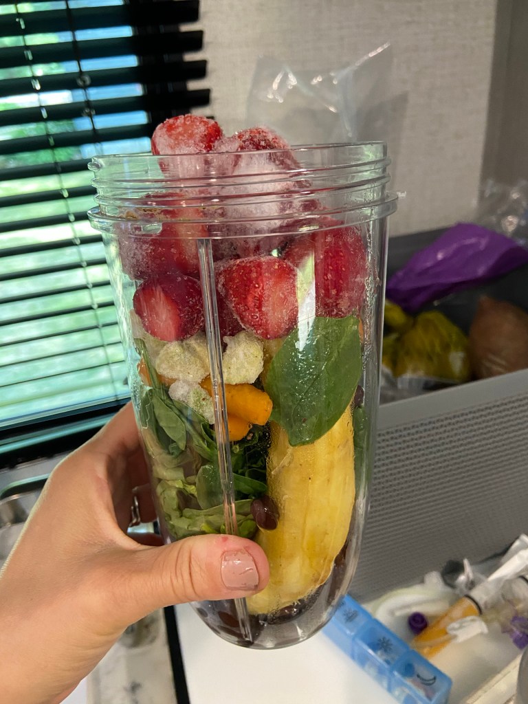 Photo below is er blend from 2 of her meals today: black beans, plantain, avocado, cooked carrots, spinach, strawberries, pink salt, and water. Her feed I blended for breakfast and lunch tomorrow: lentils, potatoes, kiwi, banana, blueberries, spinach, hemp hearts, spirulina powder, barley grass juice powder, pink salt, prunes, and water. She is definitely getting a great variety of foods everyday…