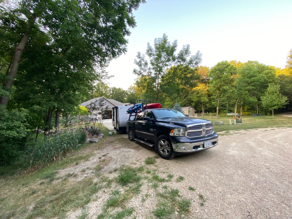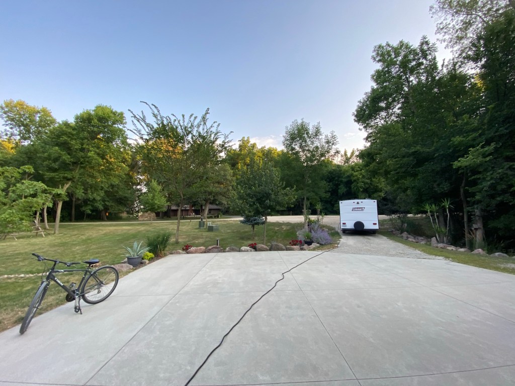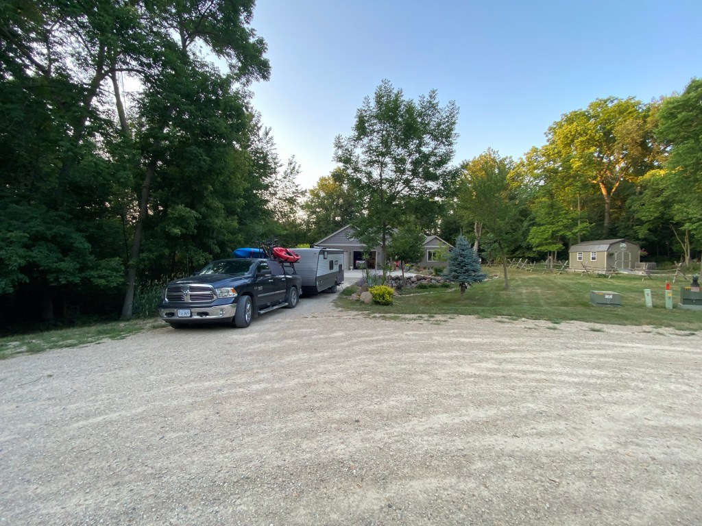 We are mooch-dock camping in their driveway. My dad hit level like it’s cool and we left it. It’s still on the trailer hitch, and we didn’t bother with the stabilizer jacks. We are hoping to get on the road by about 7-7:30 am tomorrow and wanted as little work as possible.