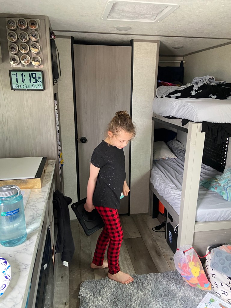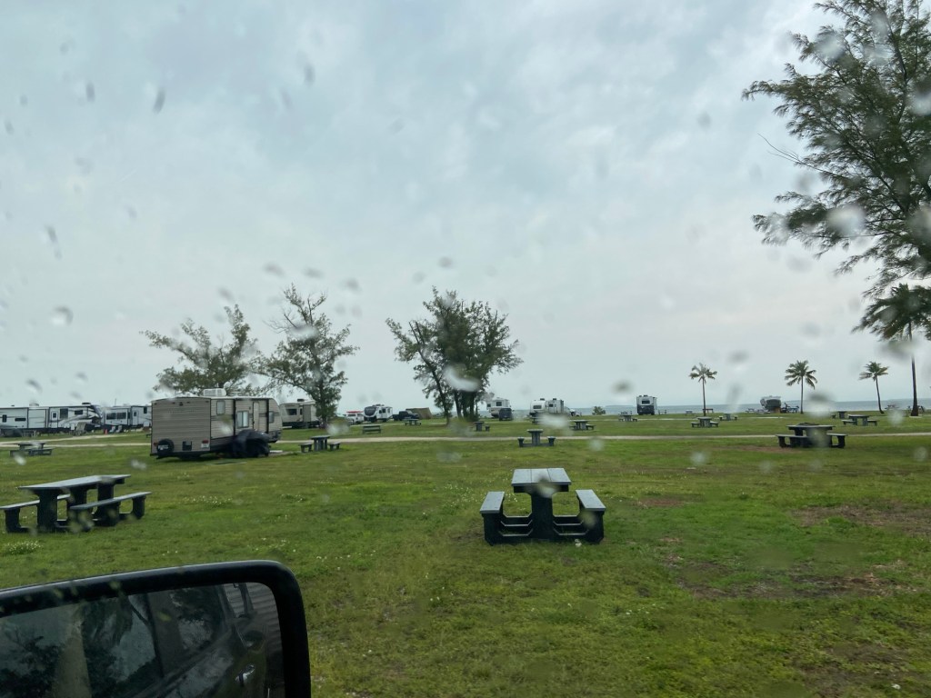 This morning we woke up to some thunder, lightning, wind, and some rain. It was a good morning to get going… even if we needed to dump the camper’s tanks and get Amelia a shower to clean her up after she got sick… all in the rain and wind.