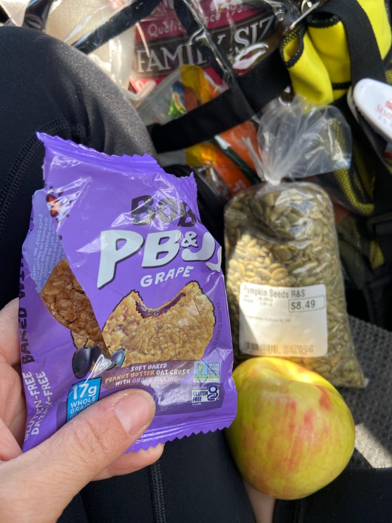 I didn’t pre-prep anything for lunch and so we all ended up having a snacky/packaged snack foods lunch (this happens occasionally on our adventure trips, but we try to not do this often). I had one of my new favorite BOBO’s PB&J bars, an apple, and some pumpkin seeds. The boys had both had granola/meal bars, apple/apple sauce squeezie, and Gardettos.