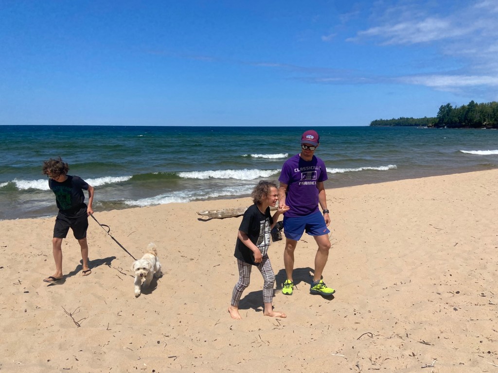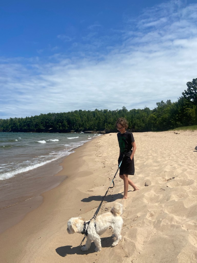 Randomly, we found a nice pull-off spot with sand on Lake Superior and used the camper’s bathroom and took a short break to walk around on the sand for a bit to stretch our legs.