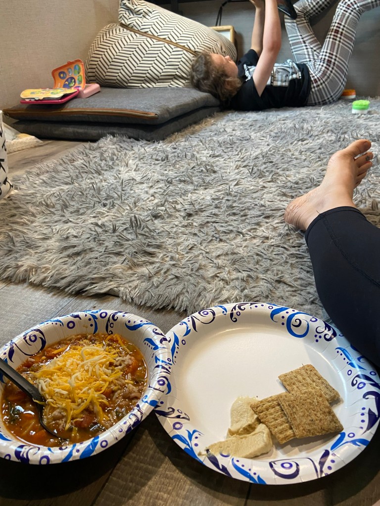 I opted to eat my dinner inside the camper on the floor while the boys ate at the picnic table. The ground outside was a bit wet and muddy, so we didn’t need Amelia getting too sassy and dirty while we ate.